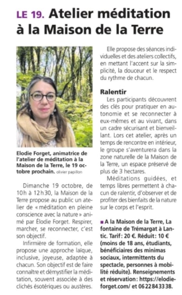 Une parenthèse ressourçante en pleine nature avec la méditation de pleine conscience : un atelier pour se reconnecter au vivant, à soi et à l'instant présent.